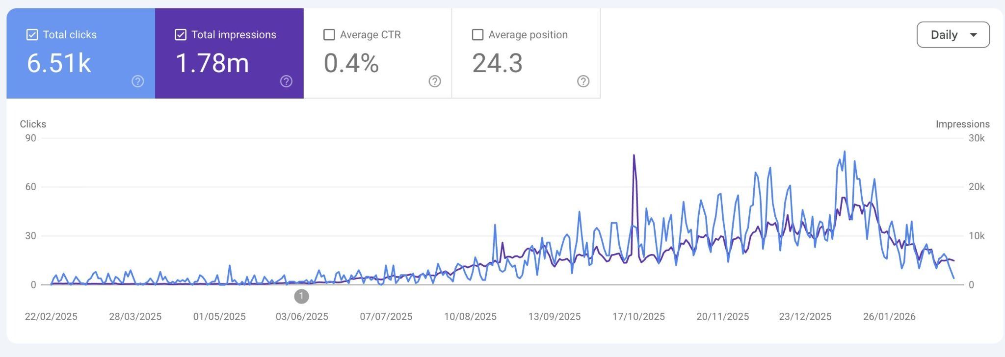 Then, on February 3, 2025, every single site lost all traction. Rankings gone. Traffic gone. The same pattern from the X thread, replicated across 20 domains.