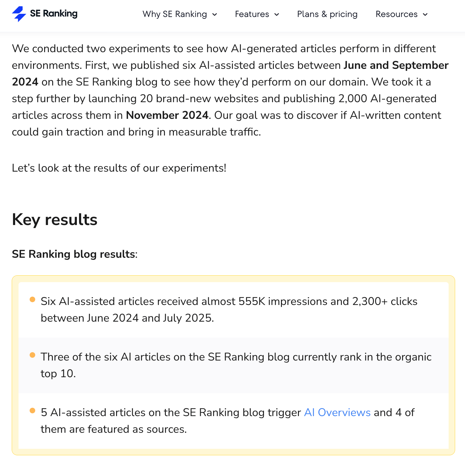 But SE Ranking also ran a parallel test. They published six AI-assisted articles on their own established blog. Same AI tool, but these articles were reviewed by their team, edited for accuracy, and enhanced with real expertise. Those six articles generated nearly 555,000 impressions and over 2,300 clicks. Three currently rank in the organic top 10, and four appear as sources in Google's AI Overviews.