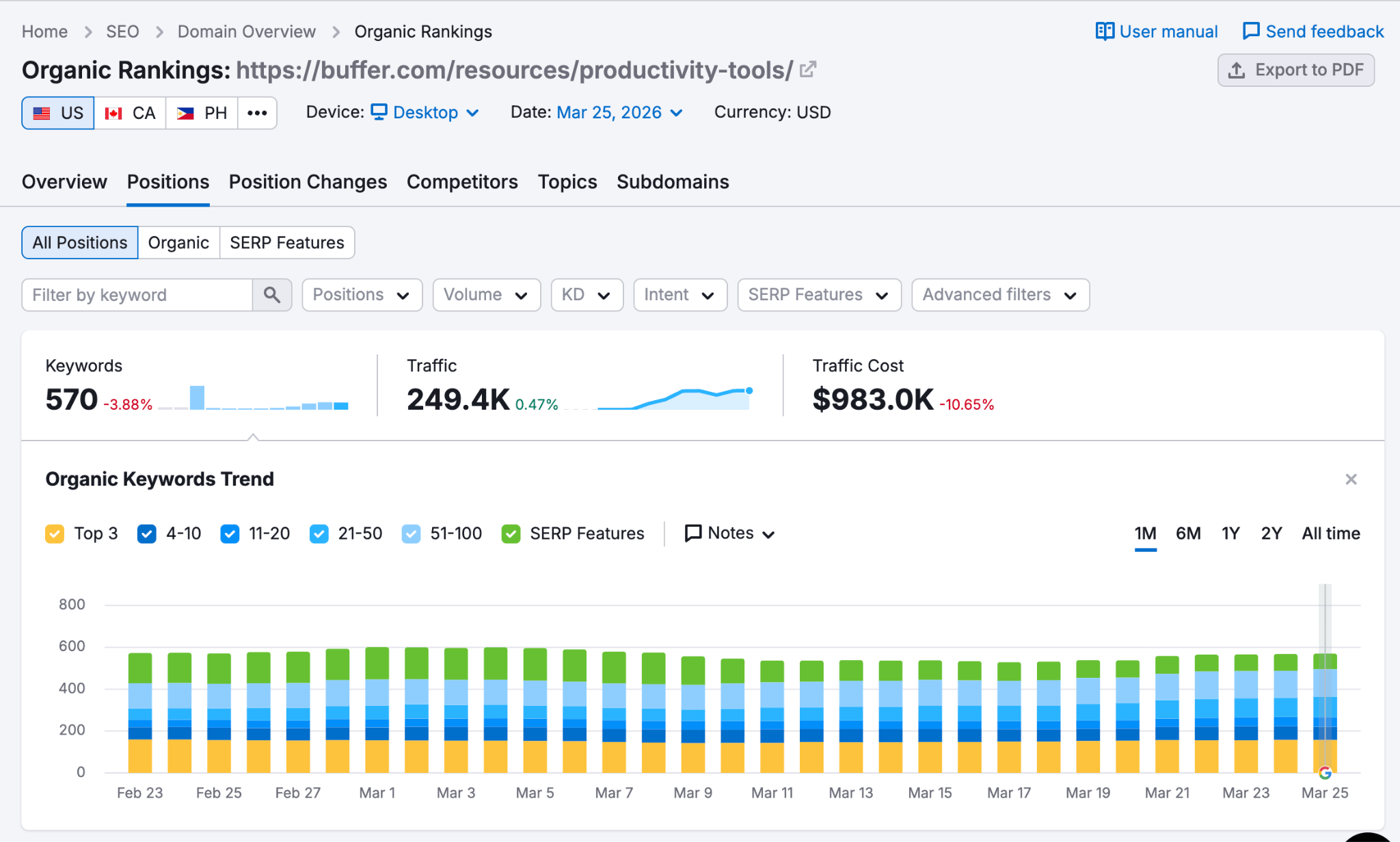 Buffer has a single "Productivity Tools" page that generates more traffic than the first three keyword types combined. It ranks #1 for "productivity tools" (a keyword with 1.83 million monthly searches) and drives approximately 249,000 monthly visitors. That's 44% of Buffer's entire organic traffic from one page.