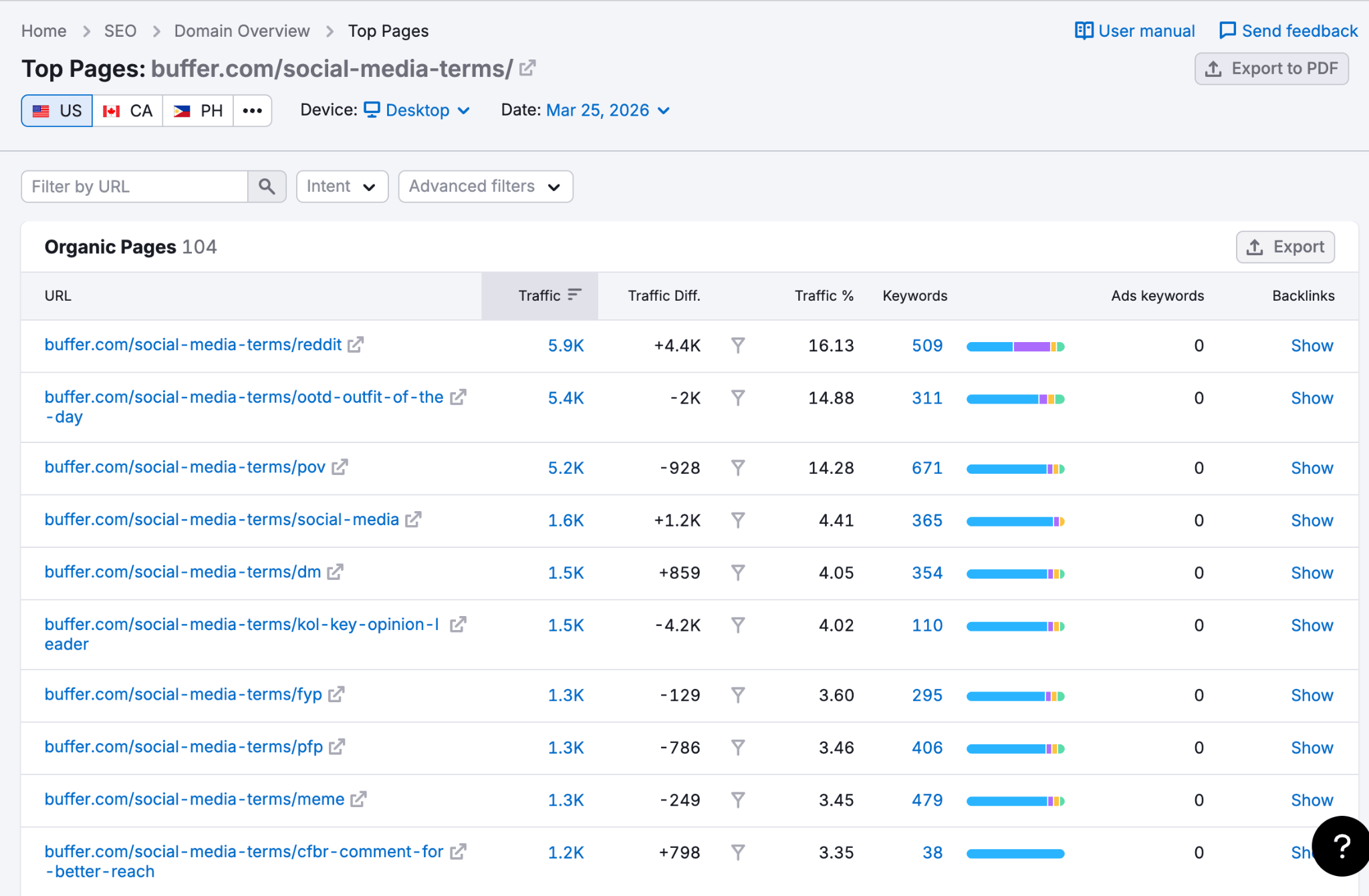 100+ of Buffer's top 1,000 keywords point to glossary pages, driving over 26,000 monthly visitors combined.
