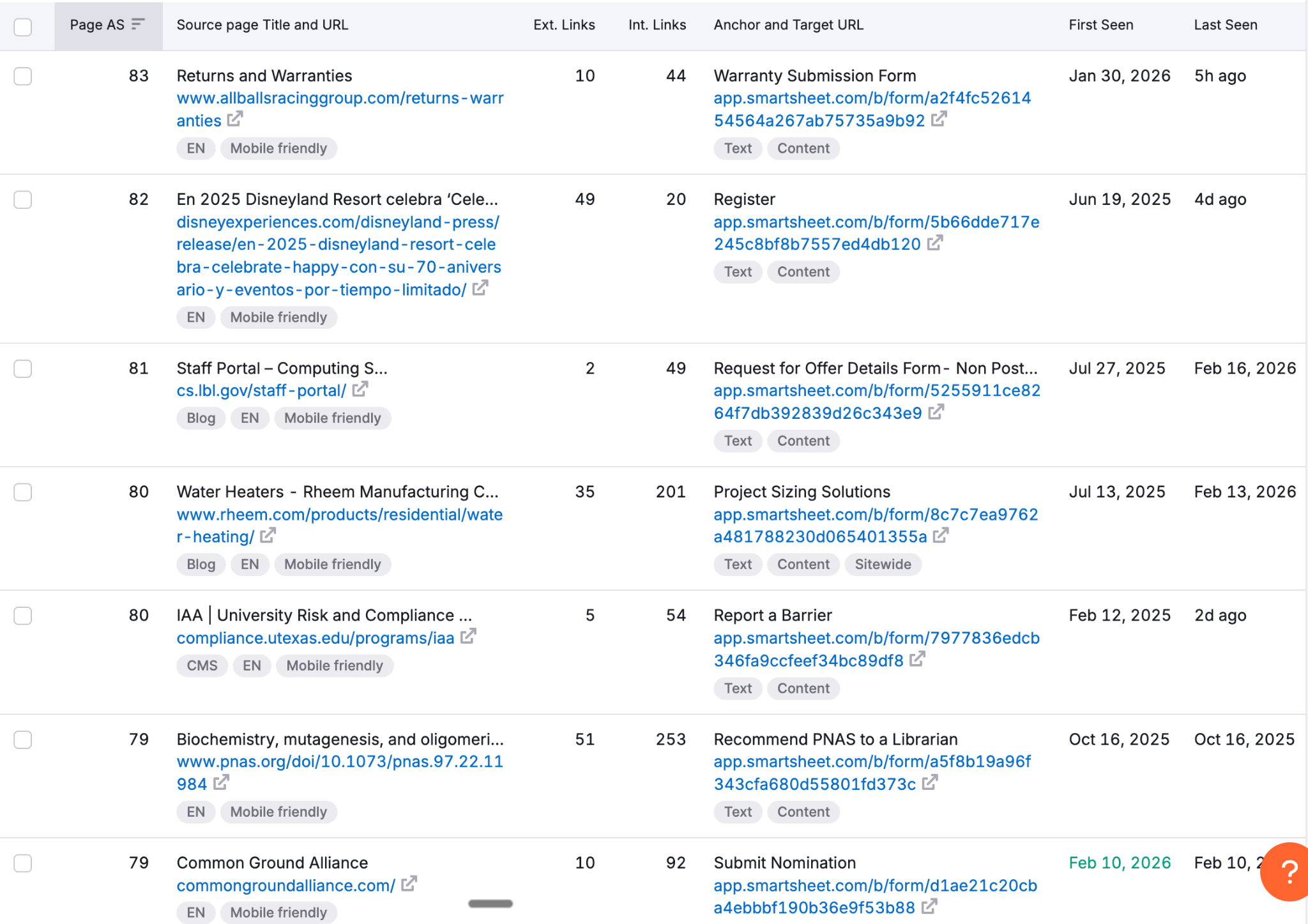 Government agencies, Fortune 500 companies, and universities all link to Smartsheet as part of their daily operations. They even have 53 backlinks from Wikipedia.